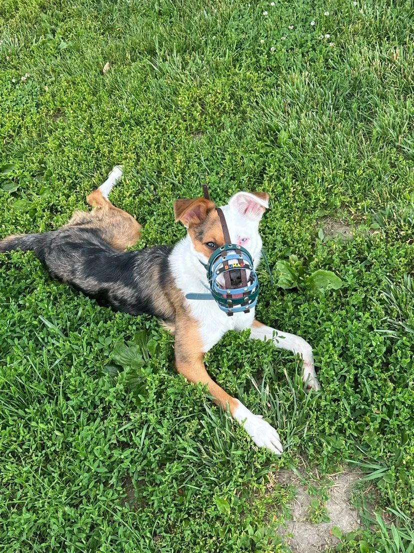 A dog lying on a grassy field with yellow flowers, in a sunny outdoor setting.
